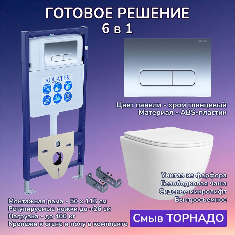 Комплект: Инсталляция Aquatek Standart 50+Кнопка 005B хром глянец+Stella T JK1121064 белый унитаз, смыв торнадо