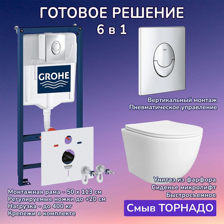 "КОМПЛЕКТ 5 в 1: Инсталляция, кнопка смыва, подвесной унитаз, крышка-сиденье с микролифтом, крепления.
