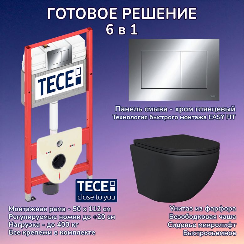 Комплект: Инсталляция TECE Base 2.0 9400412+Кнопка хром+Verna Black JK3021028MB черный унитаз