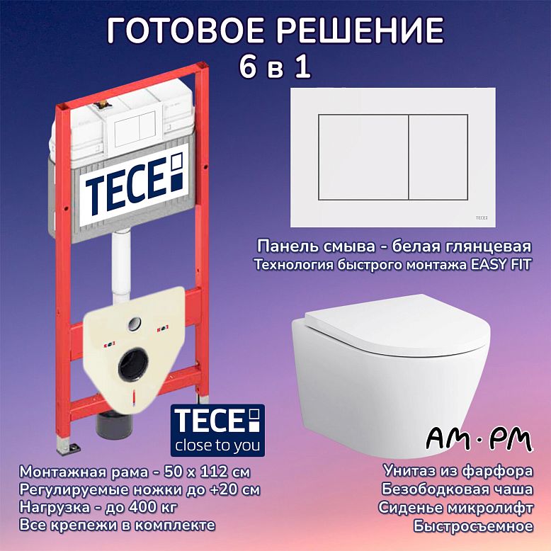 Комплект: Инсталляция TECE Base 2.0 9400413+Кнопка TECEnow белая+AM.PM Sense C741701SC белый унитаз