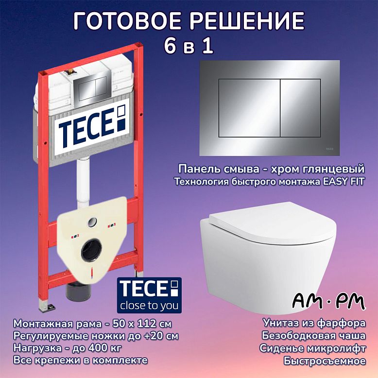 Комплект: Инсталляция TECE Base 2.0 9400412+Кнопка хром+AM.PM Sense C741701SC белый унитаз