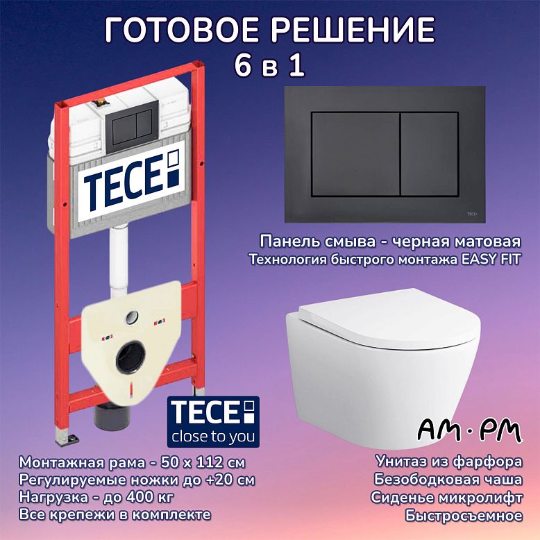 Комплект: Инсталляция TECE Base 2.0 9400414+Кнопка TECEnow черная+AM.PM Sense C741701SC белый унитаз