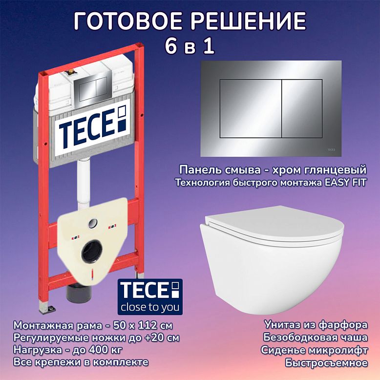"КОМПЛЕКТ 6 в 1: Инсталляция, кнопка смыва, чаша подвесного унитаза, крышка-сиденье с микролифтом, панель шумоизоляционная, крепления.
