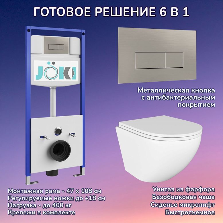 КОМПЛЕКТ 6 в 1: Инсталляция, кнопка смыва, подвесной унитаз, крышка-сиденье с микролифтом, шумоизоляция, крепления.