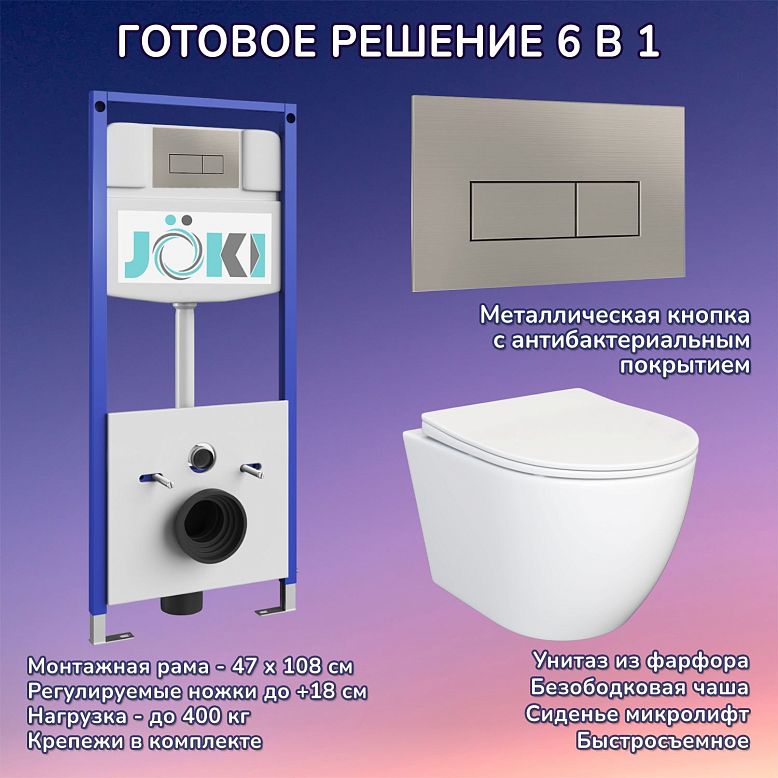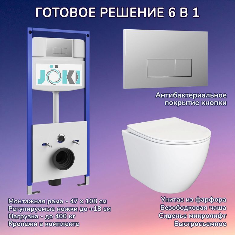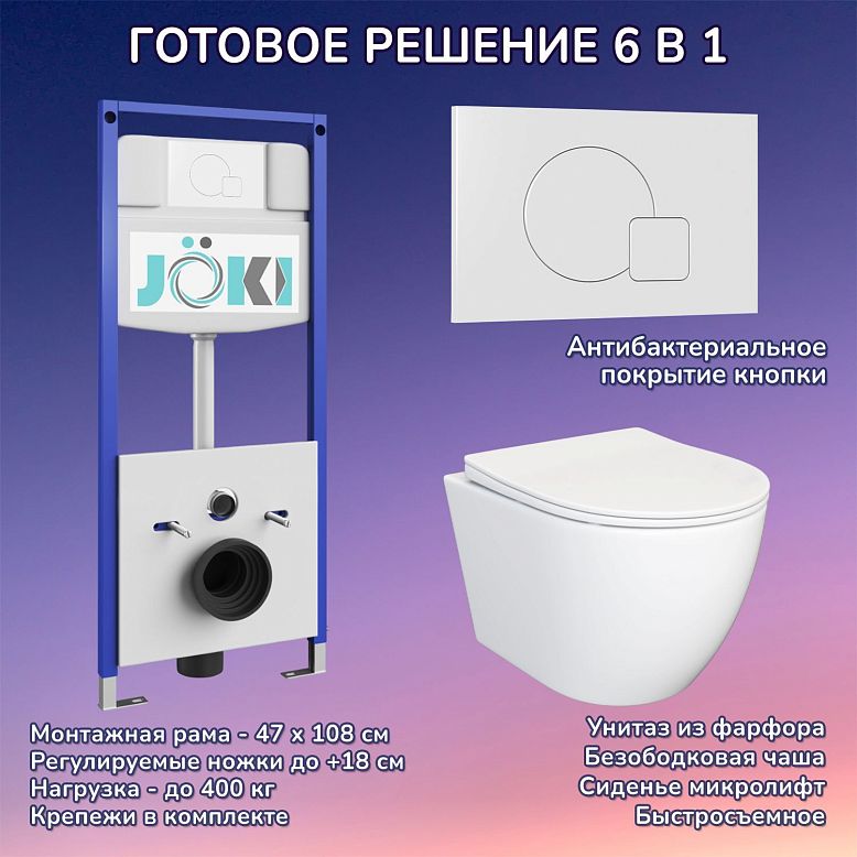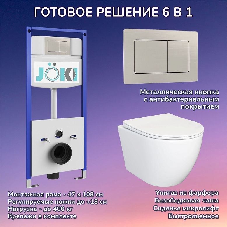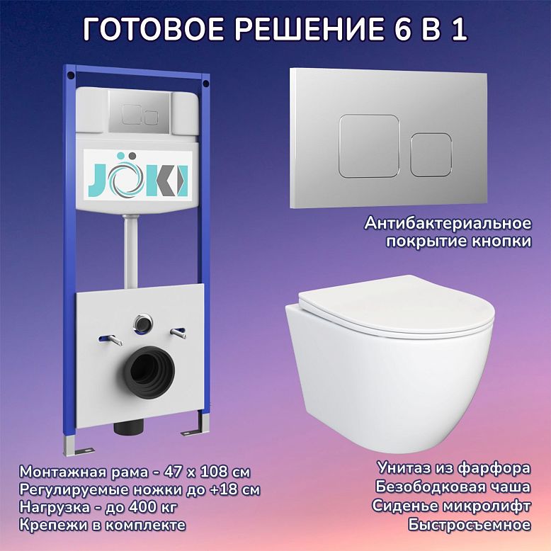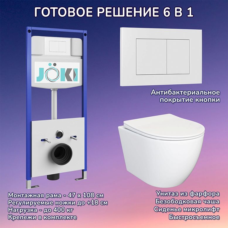 КОМПЛЕКТ 6 в 1: Инсталляция, кнопка смыва, подвесной унитаз, крышка-сиденье с микролифтом, шумоизоляция, крепления.