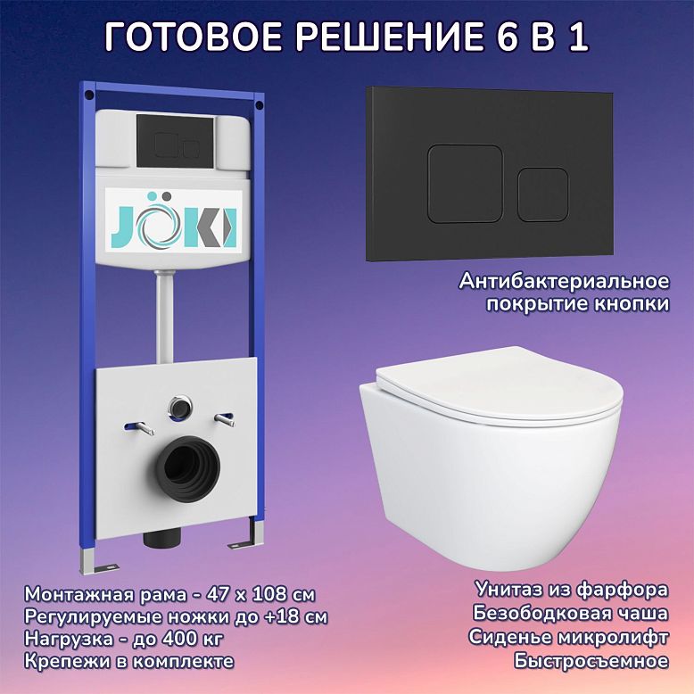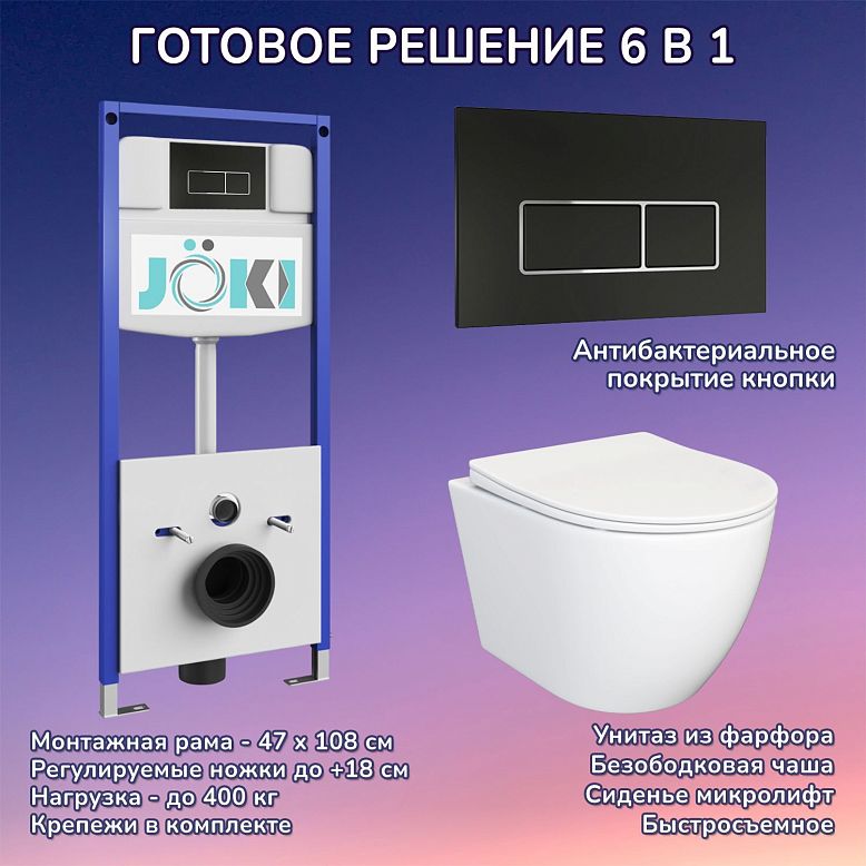 Комплект: Инсталляция JK03553+Кнопка JK023543BM черная+Stella JK1061016 белый унитаз