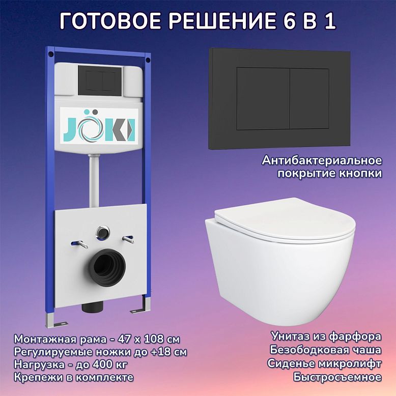 Комплект: Инсталляция JK03553+Кнопка JK023543BM черная+Stella JK1061016 белый унитаз