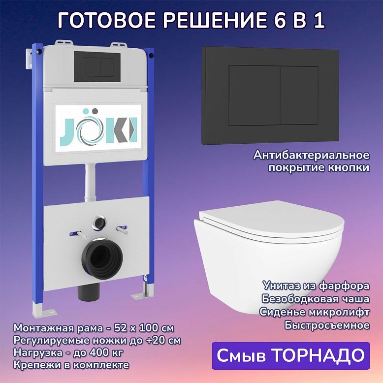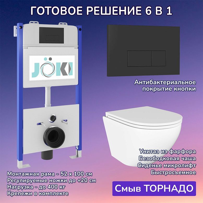 Комплект: JOKI Инсталляция JK03351 + Кнопка JK702534BM черная + Stella T JK1101010 унитаз белый, смыв Торнадо
