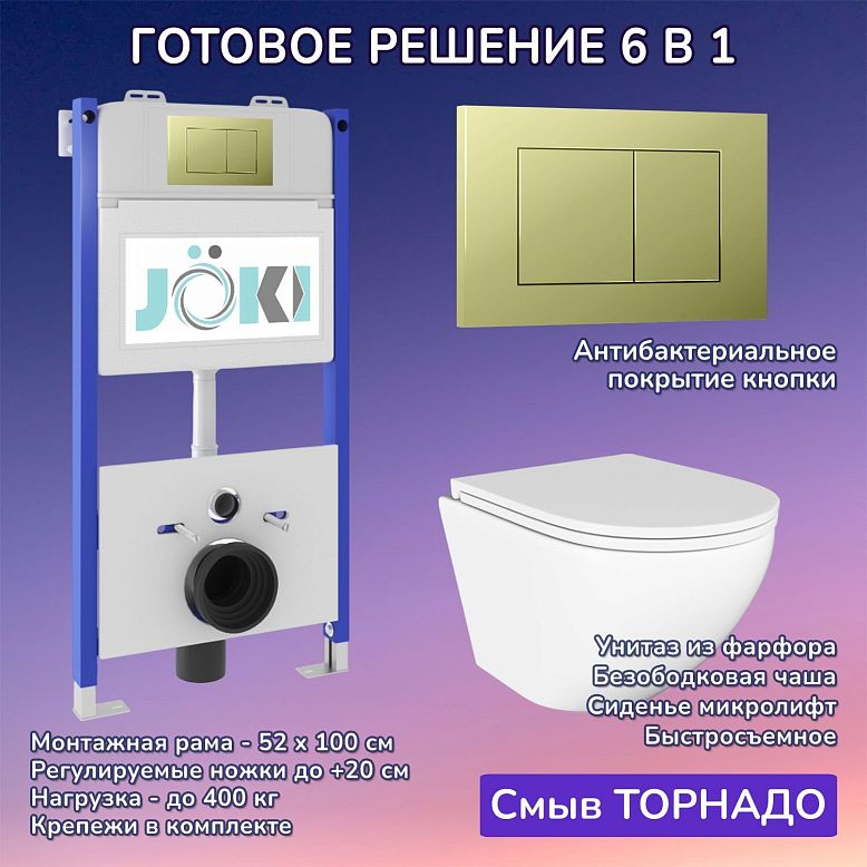 Комплект: Инсталляция JK03351+Кнопка JK007551 золото+Stella T JK1101010 белый унитаз, смыв торнадо