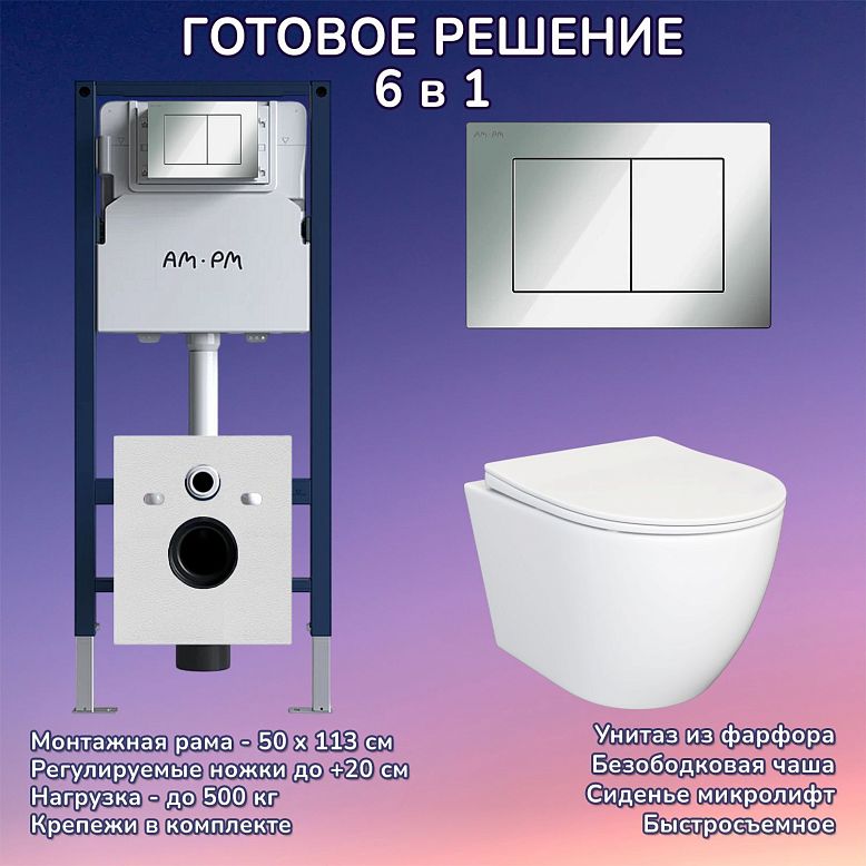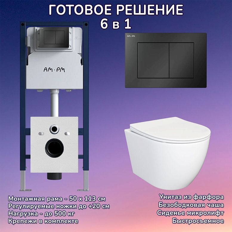 КОМПЛЕКТ 6 в 1: Инсталляция, кнопка смыва, подвесной унитаз, крышка-сиденье с микролифтом, шумоизоляция, крепления.