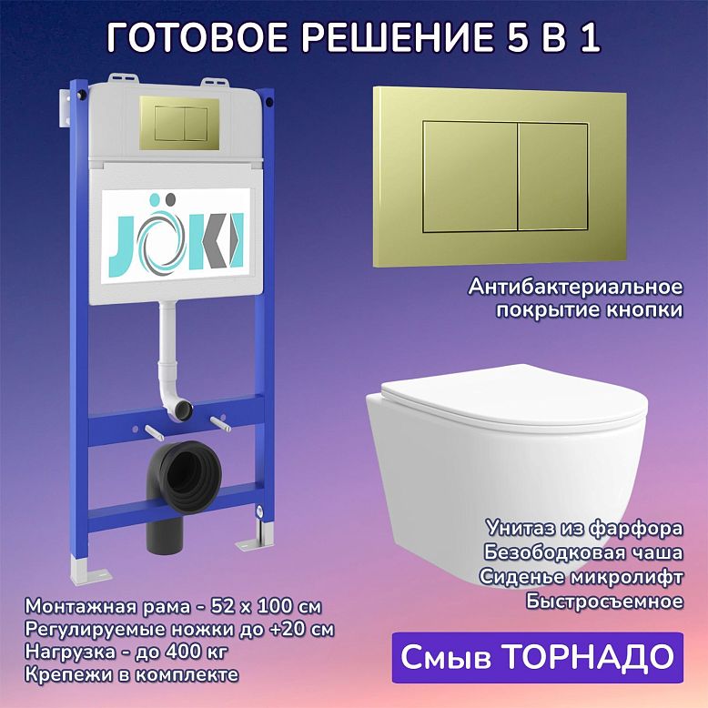 Комплект: Инсталляция JK03351+Кнопка JK207550 золото+Stella XL T JK0011011 белый унитаз, смыв торнадо