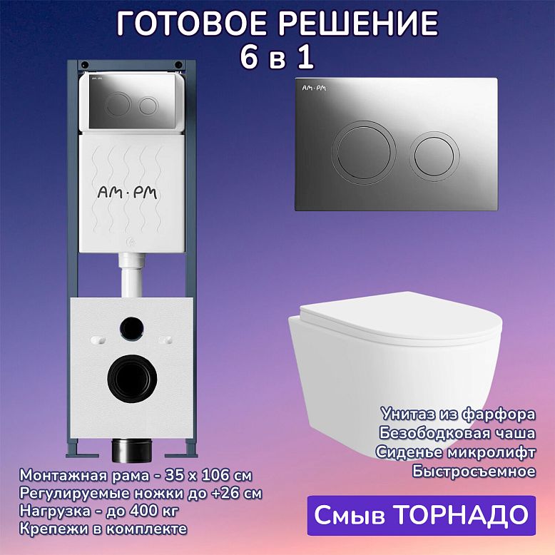КОМПЛЕКТ 6 в 1: Инсталляция, кнопка смыва, подвесной унитаз, крышка-сиденье с микролифтом, шумоизоляция, крепления.