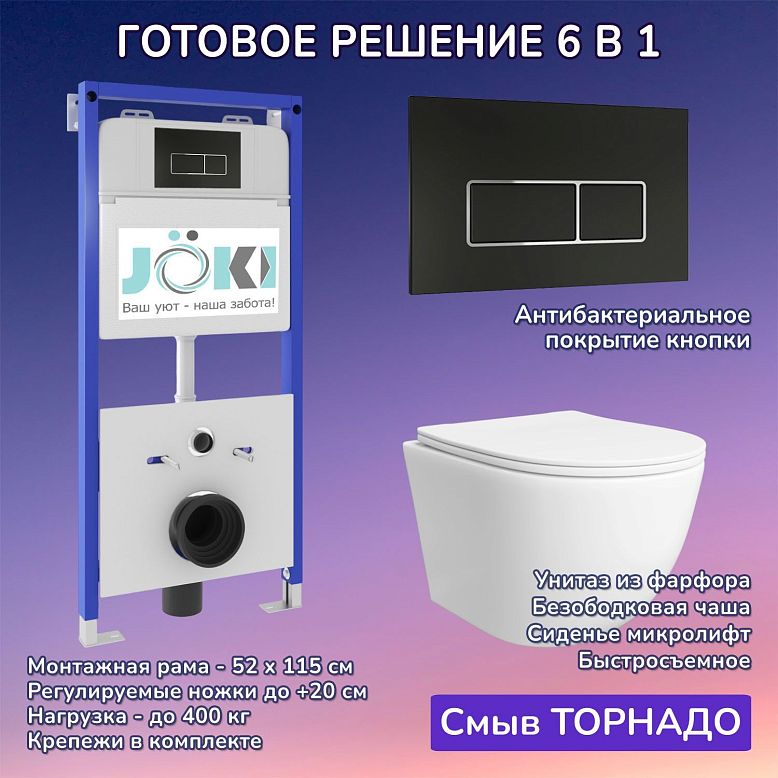 Комплект: Инсталляция JK01150 + Кнопка JK702534BM черная + Stella T JK1121064 белый унитаз, смыв Торнадо