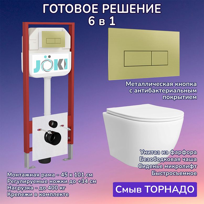 Комплект: Инсталляция JK45045+Кнопка JK207550 золото+Stella T JK1121064 белый унитаз, смыв торнадо