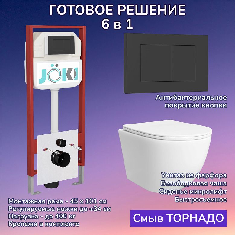 Комплект: Инсталляция JK45045 + Кнопка JK702534BM черная + Stella T JK1121064 белый унитаз, смыв Торнадо
