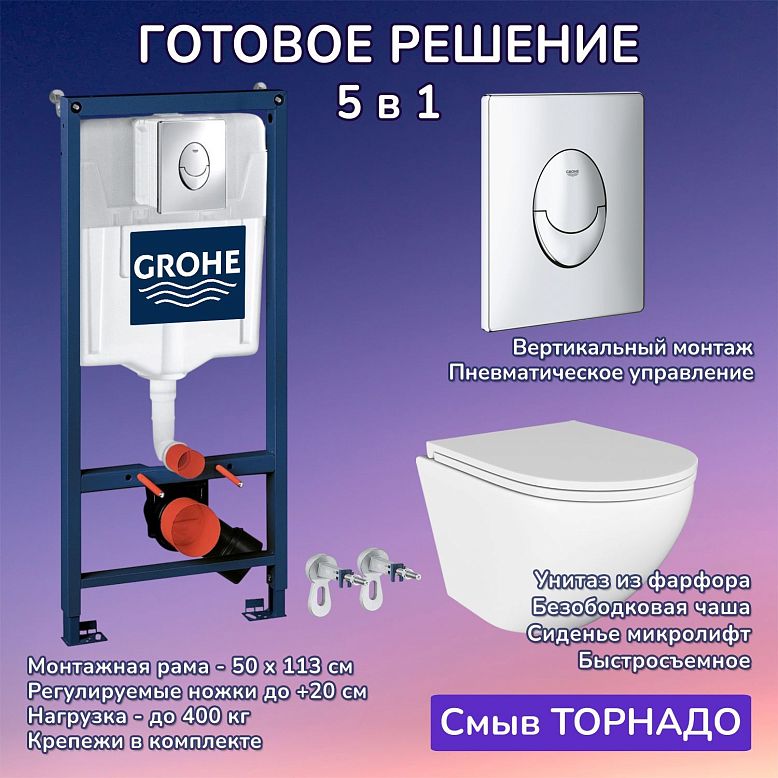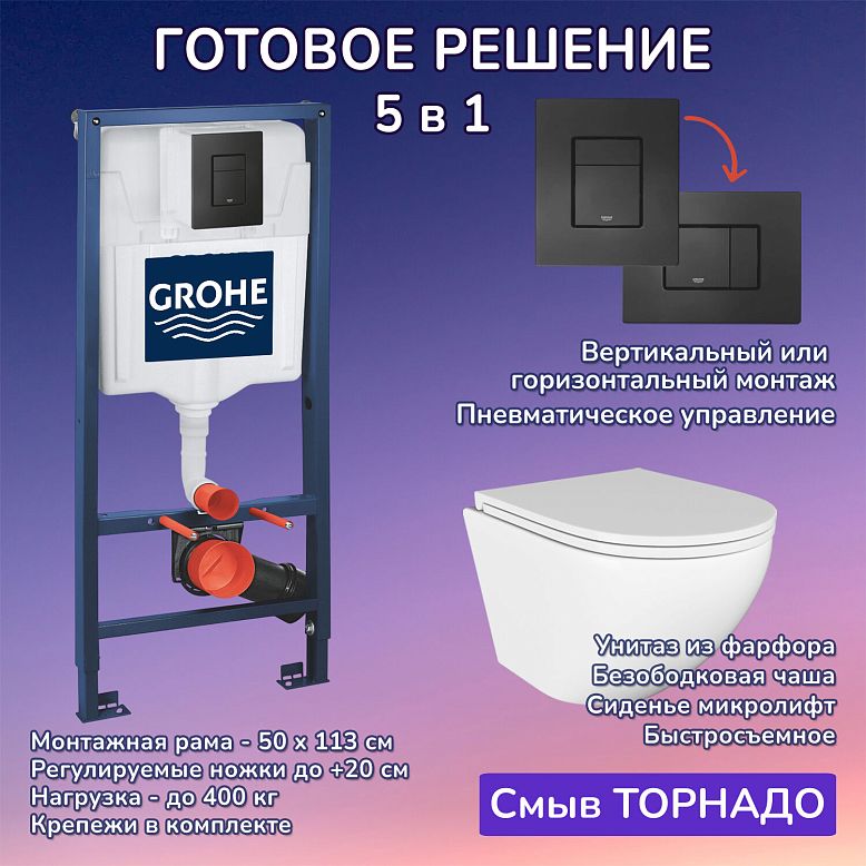 "КОМПЛЕКТ 6 в 1: Инсталляция, кнопка смыва, подвесной унитаз, крышка-сиденье с микролифтом, звукоизоляционный комплект, крепления.