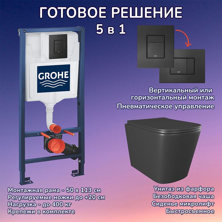 Комплект: Инсталляция Grohe 38721001 кнопка хром+Verna Black JK3021028MB черный унитаз