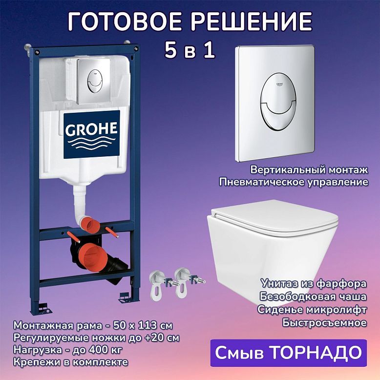 "КОМПЛЕКТ 6 в 1: Инсталляция, кнопка смыва, подвесной унитаз, крышка-сиденье с микролифтом, звукоизоляционный комплект, крепления.