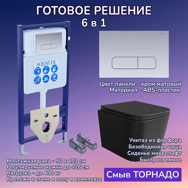 Комплект: Инсталляция Aquatek Standart 50+Кнопка 005A белый глянец/хром+JOKI Verna T JK0711055MB черный унитаз, смыв торнадо