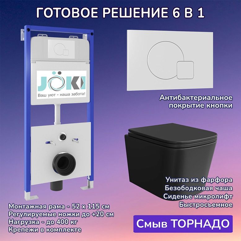 Комплект: Инсталляция JK01150+Кнопка JK020522WM белая+Verna T JK0711055MB черный унитаз, смыв торнадо