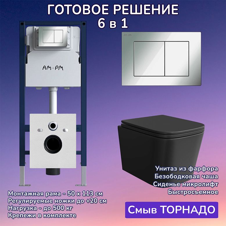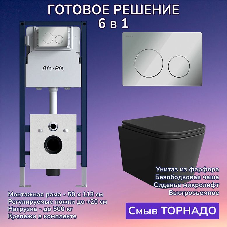 Комплект: Инсталляция AM.PM I012709+Кнопка I090151 хром +JOKI Verna T JK0711055MB черный унитаз, смыв торнадо