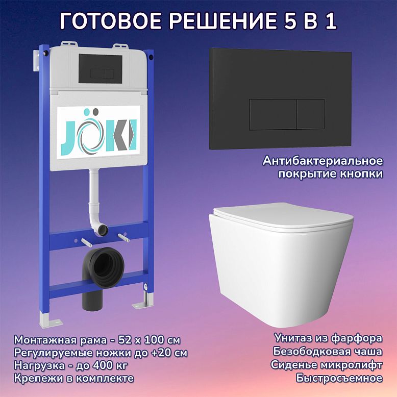 Комплект: Joki Инсталляция JK03351 + Кнопка JK203507BM черная + Унитаз Verna JK3021022 белый