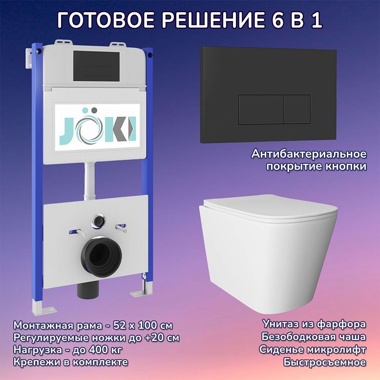 Комплект: Joki Инсталляция JK03351 + Кнопка JK203507BM черная + Унитаз Verna JK3021022 белый