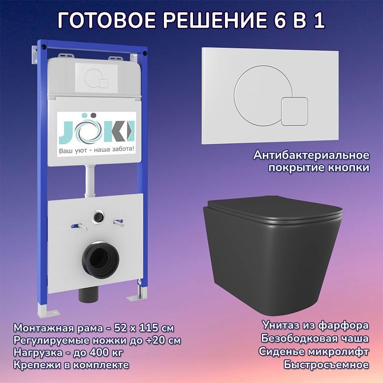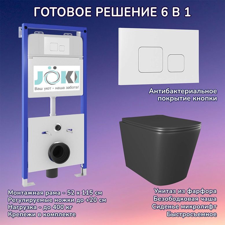 Комплект: Инсталляция JK01150 + Кнопка JK020522WM белая + Verna JK3021028MB черный унитаз