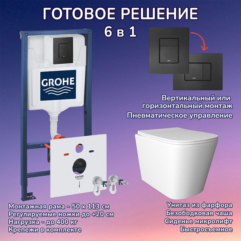 Комплект: Инсталляция Grohe 38811KF0 черная кнопка+Verna JK3021022 белый унитаз