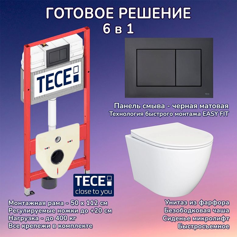 Комплект: Инсталляция TECE Base 2.0 9400413+Кнопка TECEnow белая+Verna T JK0711055MB черный унитаз, смыв торнадо